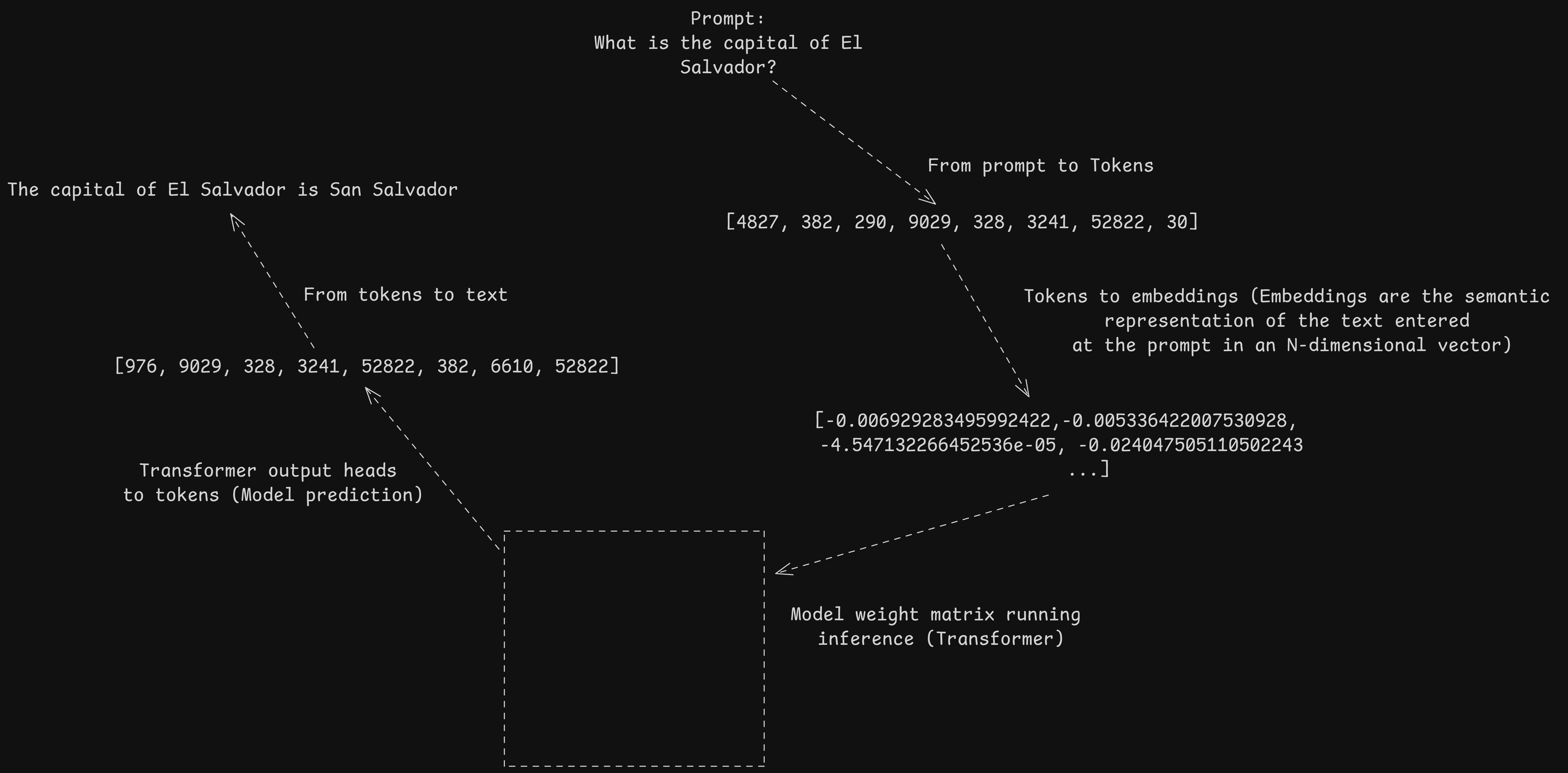 The following diagram visually represents the complete functioning of these models: from the input (prompt), the tokenization of the text, the generation of embeddings, the execution of the attention mechanism by the Transformer model, the prediction of tokens and finally the conversion back to text. This entire process is called inference: